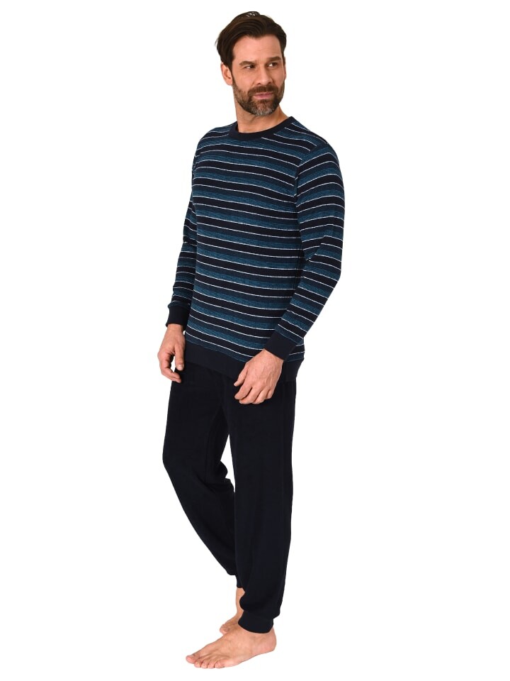 Мужская длинная махровая пижама, пижама с мелким узором в полоску. Элегантная мужская длинная пижама – идеальный выбор для зимы. Махровая ткань особенно теплая и мягкая, приятная на коже. В этой мужской пижаме с длинными рукавами вам не будет холодно по ночам. Манжеты на рукавах и штанинах предотвращают соскальзывание пижамы в ночное время. И ты даже выглядишь хорошо! Мелкий полосатый узор неподвластен времени, а игривые цвета придают пикантность этому пижамному комплекту. Благодаря этому махровая пижама станет вашим лучшим другом в течение дня, когда вы отдыхаете, смотрите телевизор или читаете. Наш свободный крой обеспечивает высокий уровень комфорта и настоящее удовольствие.