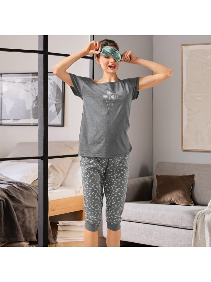 REDBEST женская пижама из одинарного джерси. Повседневный и очаровательный вариант для спокойных вечеров. Мотив с принтом одуванчика украшает как верх с рукавами реглан и круглым вырезом, так и капри по всей поверхности с широким пришитым эластичным поясом, завязкой, боковыми карманами и манжетами.