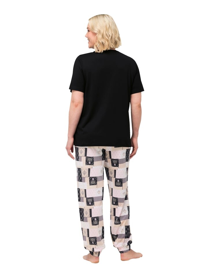 Пижама, костюм-двойка. Однотонная рубашка с декоративными складками под V-образным вырезом, полурукавами. Широкие прямые брюки с разнообразными узорами, боковыми карманами и эластичным поясом.