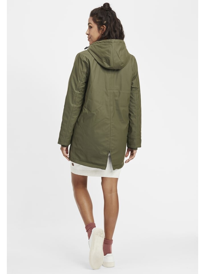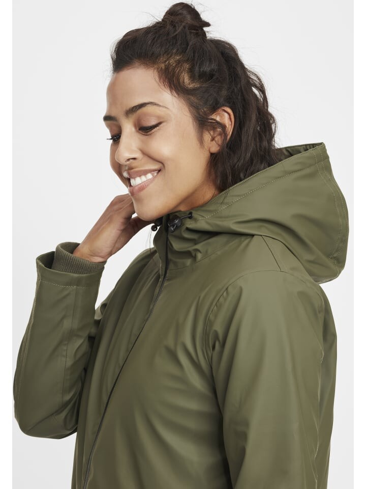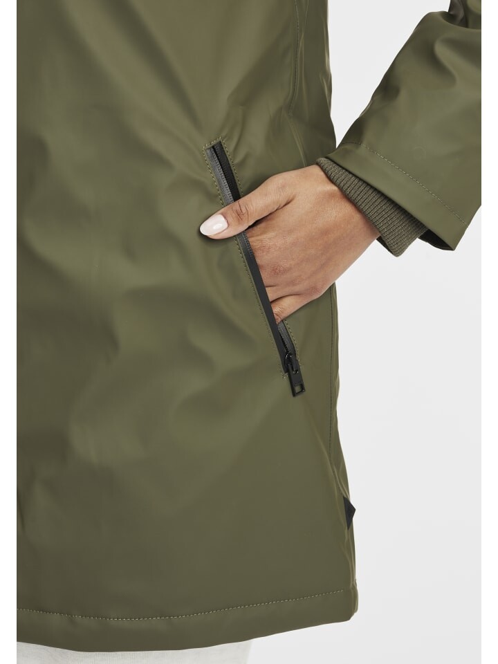 ДЕТАЛИ И ОСОБЕННОСТИ: Водонепроницаемая куртка-дождевик с капюшоном и эластичными шнурами, два окантованных кармана на молнии, стеганый внутренний материал, черная нашивка из искусственной кожи на левом боковом шве, ветронепроницаемые ребристые манжеты на рукавах, удлиненная спинка