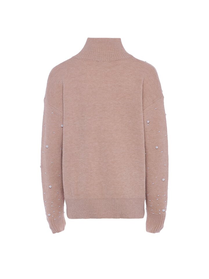 Представляем вашему вниманию изысканный свитер с высоким воротником и ребристыми деталями на воротнике, манжетах и подоле. Украшен небольшими блестящими украшениями, разбросанными по всему изделию, придающими ему элегантность. Модель имеет прямой крой и идеально подходит для использования в качестве верхней одежды.