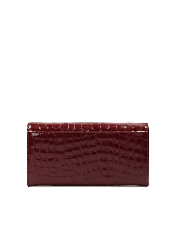Бордовый кошелек из лакированной кожи с тиснением выглядит элегантно и стильно. Простая форма с клапаном практична, тонка и помещается в большинство сумочек. Кошелек с ярким дизайном подчеркивает смелый стиль своей обладательницы. Данная модель имеет просторное внутреннее отделение, в котором можно хранить банкноты, платежные карты, монеты и важные документы.