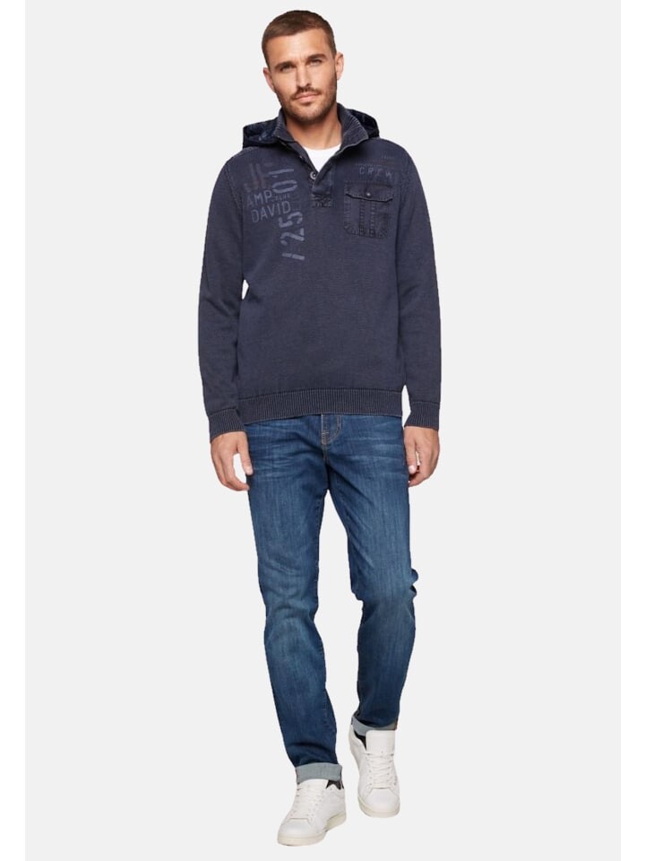 Мужской вязаный свитер – незаменимая вещь в гардеробе. Модель стандартного кроя, изготовленная из высококачественного материала, обеспечивает высокий уровень комфорта. Свитер имеет тройной воротник с планкой на пуговицах и капюшон, который можно снять на молнию. Воротник, манжеты и подол имеют ребристый вид. Капюшон выделяется благодаря сочетанию материалов и имеет стеганый вид. Потертый дизайн придает свитеру особенный вид. Отпечатки этикеток создают визуальную изюминку. Дизайн завершается накладным нагрудным карманом с пуговицей и нашивкой с этикеткой на левом рукаве и на капюшоне.
