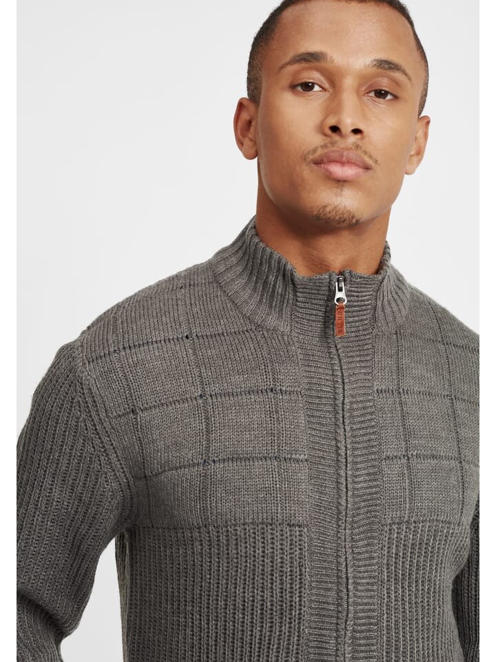 ДЕТАЛИ И ОСОБЕННОСТИ: Качественный вязаный свитер с воротником-стойкой, контрастными узорами вязки, эластичными и ребристыми манжетами и манжетами, кожаной аппликацией по краю и на молнии.