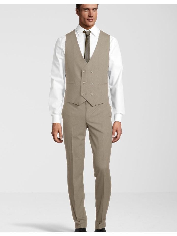 - Современный облегающий- прилегающий костюм с двубортным жилетом с регулировкой по ширине, элегантными костюмными брюками на узких штанинах и жакетом с однобортной застежкой