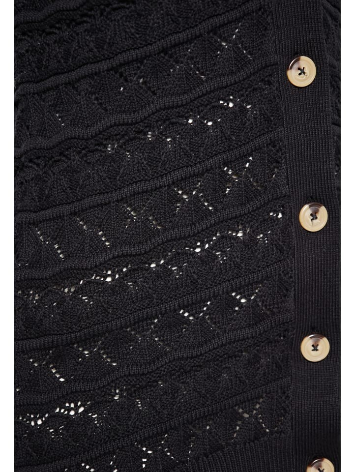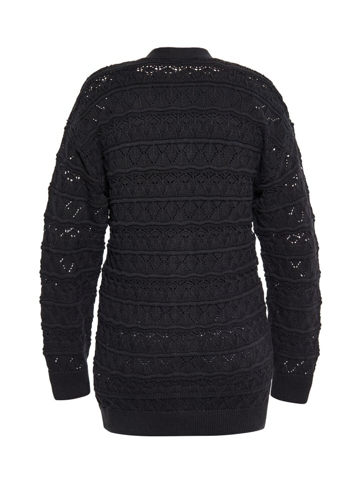 Представляем удлиненный кардиган с длинными рукавами, который представляет собой идеальное сочетание повседневного и элегантного стиля. Трикотажная модель имеет замысловатую текстуру и кружевные детали, а ребристый воротник, подол и манжеты придают нотку изысканности. Этот кардиган с круглыми пуговицами среднего размера в центре спереди станет незаменимым аксессуаром для каждого человека, следящего за модой.