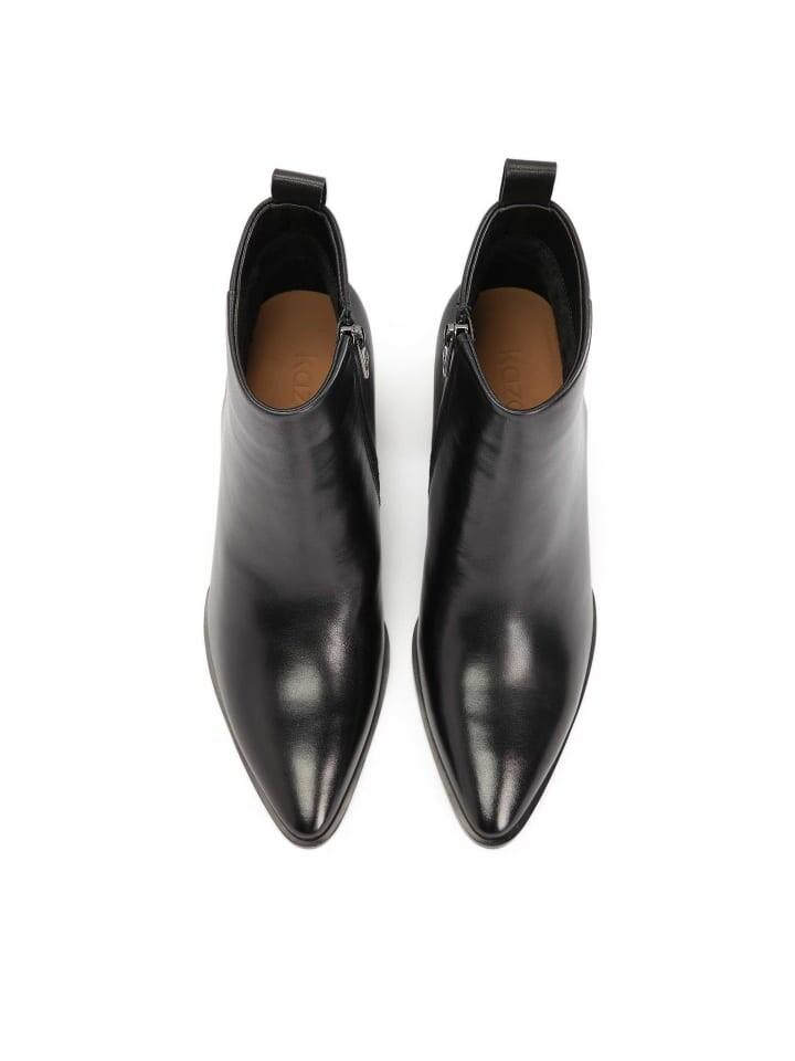 Сапоги с простым голенищем, заканчивающимся заостренным носком, изготовлены из черной кожи. В этой модели бросается в глаза пятиугольный металлический каблук, украшенный крупными камнями. Этот декоративный элемент придает обуви шикарный и необыкновенно роскошный вид. Их с успехом можно носить как с повседневными, так и со строгими нарядами.