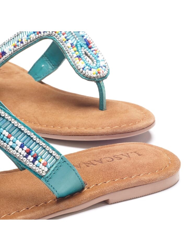 Мюли-мюли с разделителем пальцев из кожи с декоративными бусинами от LASCANA. В этническом стиле. С особенно мягкой стелькой. Материал верха выполнен из смеси материалов овечьей кожи и синтетики, подкладка из овечьей кожи и стелька из козьей кожи, подошва из синтетики.