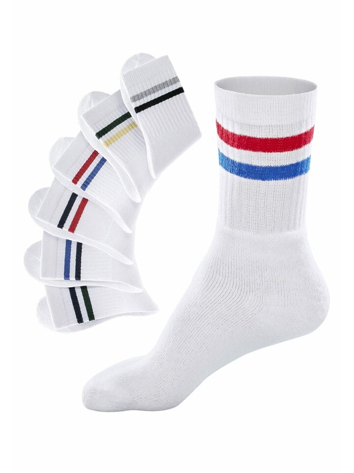 Заказать сейчас! Разнообразные основы для каждой возможности. Просто комбинируйте по своему желанию. Базовые носки для спортивных людей! Даже при высоких нагрузках климат ног остается свежим, а носки не скользят. Благодаря махровой подошве и усиленному каблуку этот партнер для тренировок имеет особенно мягкую подкладку и долгое время остается как новый. Легкий в уходе материал впитывает пот и сохраняет ноги сухими. Закажите сейчас: в спортивном стиле с цветными полосками под манжетами. Доступны в упаковке по 6 штук. Детали: Хорошая посадка благодаря ребристой структуре, усиленные зоны напряжения для оптимальной долговечности, отсутствие точек давления благодаря махровой ткани, двухволоконное качество, скрученный, материал: различные типы волокон, спортивные носки, с кольцами, идеально подходит для занятий спортом и отдыха, для приятного климата ног для него и для нее