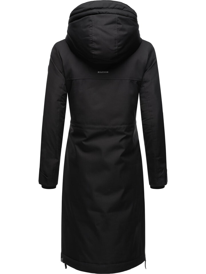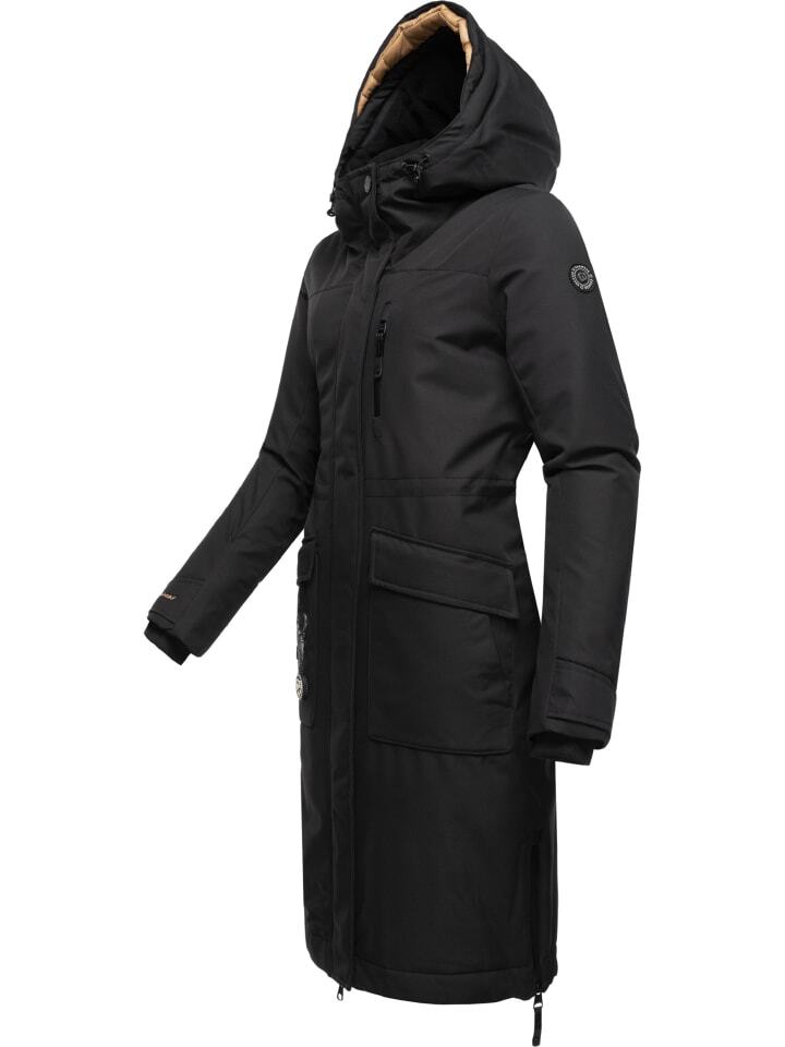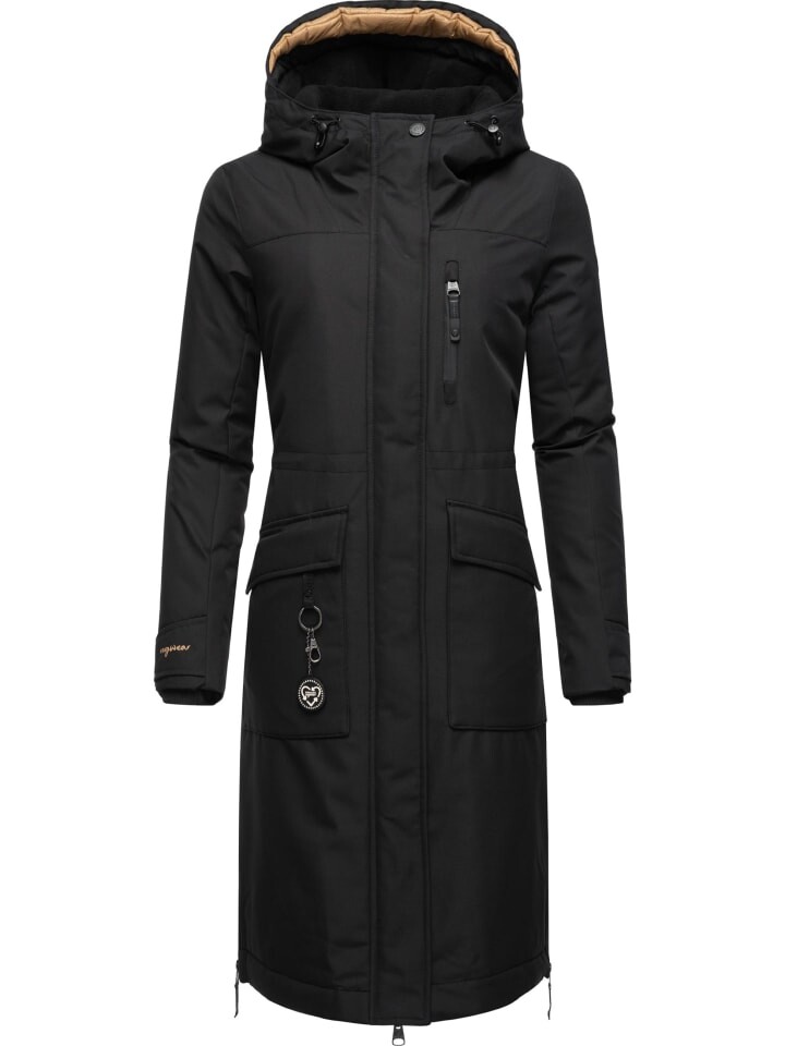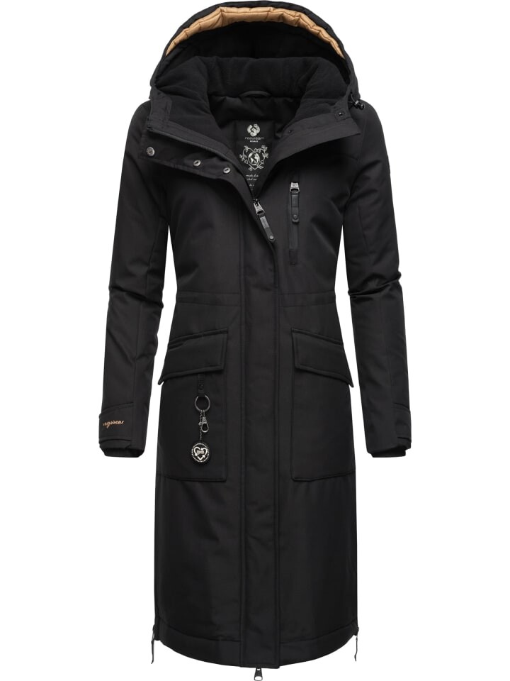 ВИД: Экологичная длинная женская зимняя куртка от Ragwear из переработанного полиэстера, капюшон и воротник на подкладке из мягкого флиса, практичное кольцо для ключей на правом кармане куртки, 100% веганское производство