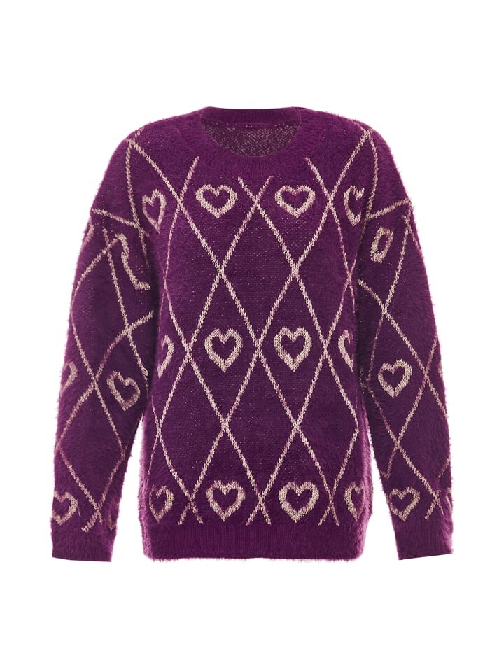 Вязаный свитер от ebeeza из смеси ворсованной пряжи имеет слегка ворсистый вид и чувственный узор в виде сердечек из металлизированной пряжи золотистого цвета. В дополнение к классической форме он отличается вырезом на плечах и ребристыми трикотажными манжетами на конце.