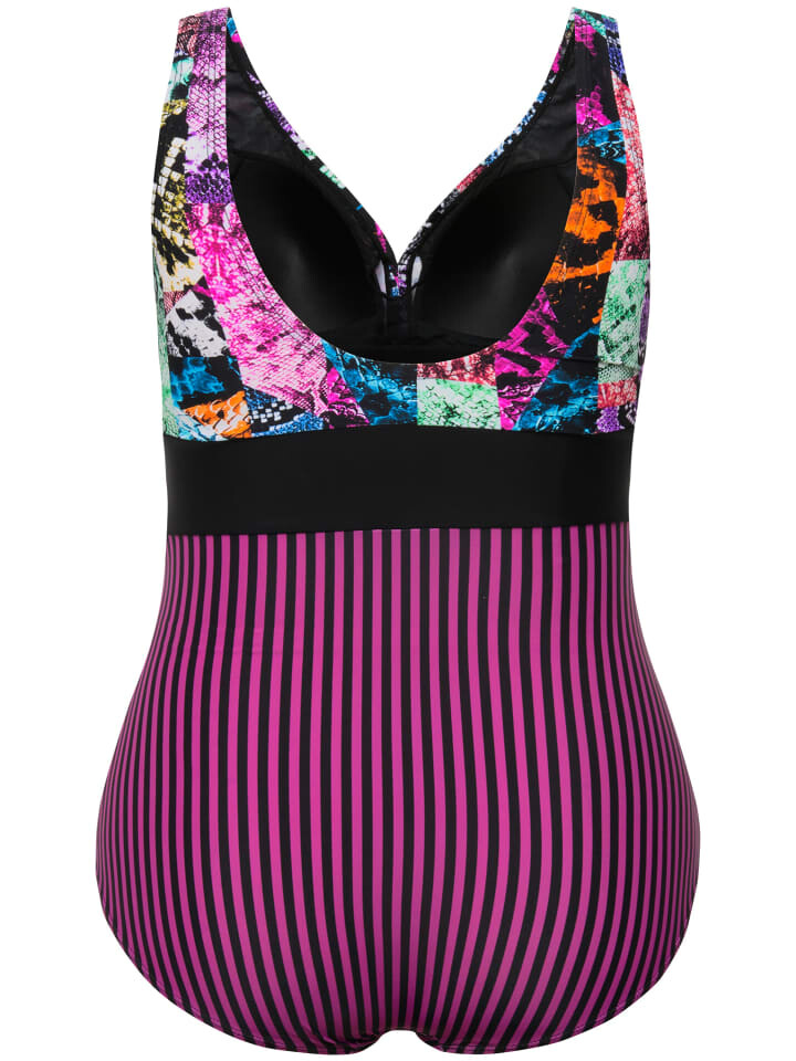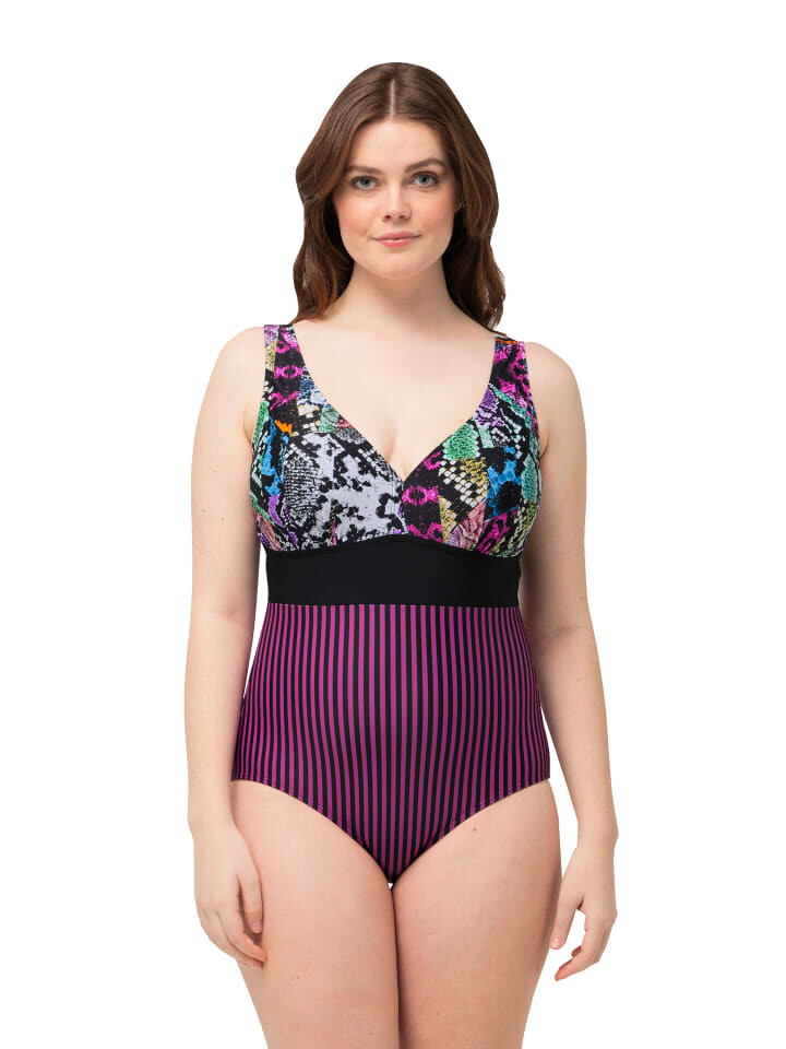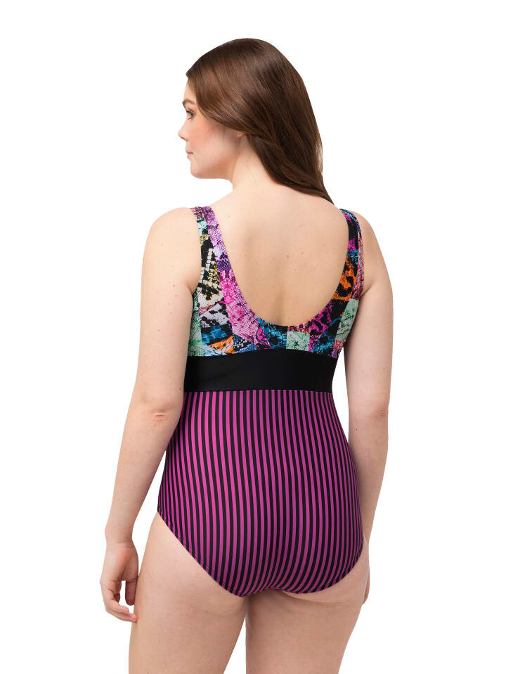 Купальник с мягкими чашками, бюст с миксом анималистического рисунка. Под вырезом в форме сердца задрапирована лента. Лента под грудью, поддерживающая подкладка из сетки Powermeet спереди.