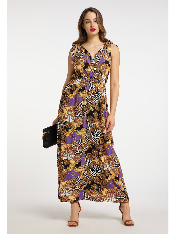 Это творение Faina символизирует чистый гламур. Элегантная модель макси выполнена из мягкой струящейся вискозы и имеет верх с эффектом запаха и завязываемыми бретелями. Сплошной принт в стиле Ренессанс и анималистический принт сияет золотыми и черными тонами на цветном фоне. Модель хорошо облегает фигуру благодаря резинке на талии. Носите платье на подкладке с любимыми туфлями или вечерними высокими каблуками.