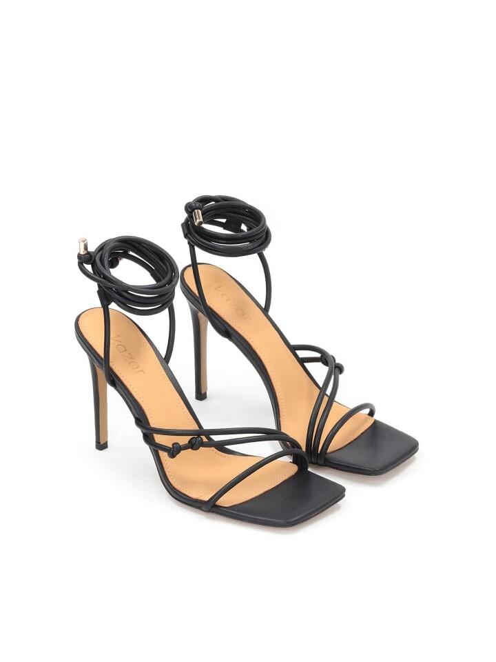 Исключительно женственные босоножки на высоком каблуке впечатляют оригинальным дизайном. Шнуровка вокруг щиколотки и угловые ремешки на подушечке стопы создают оригинальный дуэт, который выглядит особенно привлекательно. Туфли изготовлены из высококачественной лицевой кожи классического черного цвета, который подходит ко всему. Оригинальные босоножки – идеальная модель для лета, которая привлечет заинтересованные взгляды.