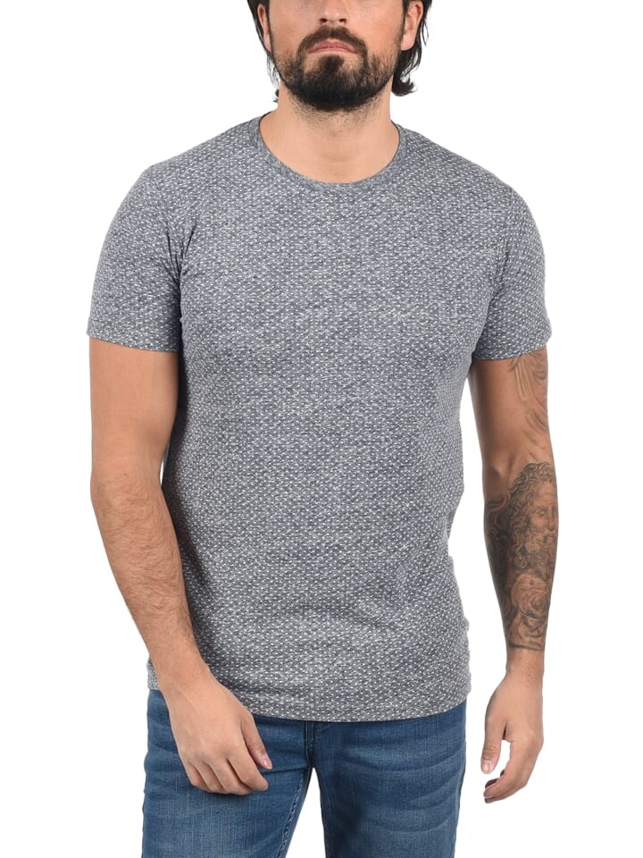 ДЕТАЛИ И ОСОБЕННОСТИ: Меланжевый вид, принт по всей поверхности, круглый вырез горловины, прямой низ, тканевая нашивка на боковом шве.