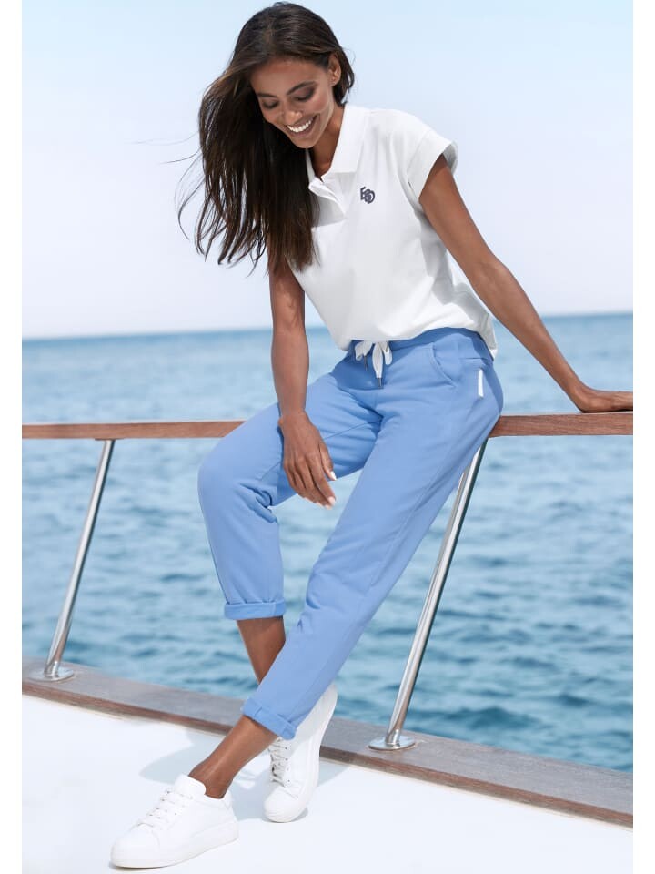 Спортивные штаны от ELBSAND с манжетами по подолу. Пояс с кулиской и флоковым принтом с логотипом сзади. Боковые карманы. Внутренняя длина штанины около 78 см. Изготовлен из 95% хлопка, 5% эластана.