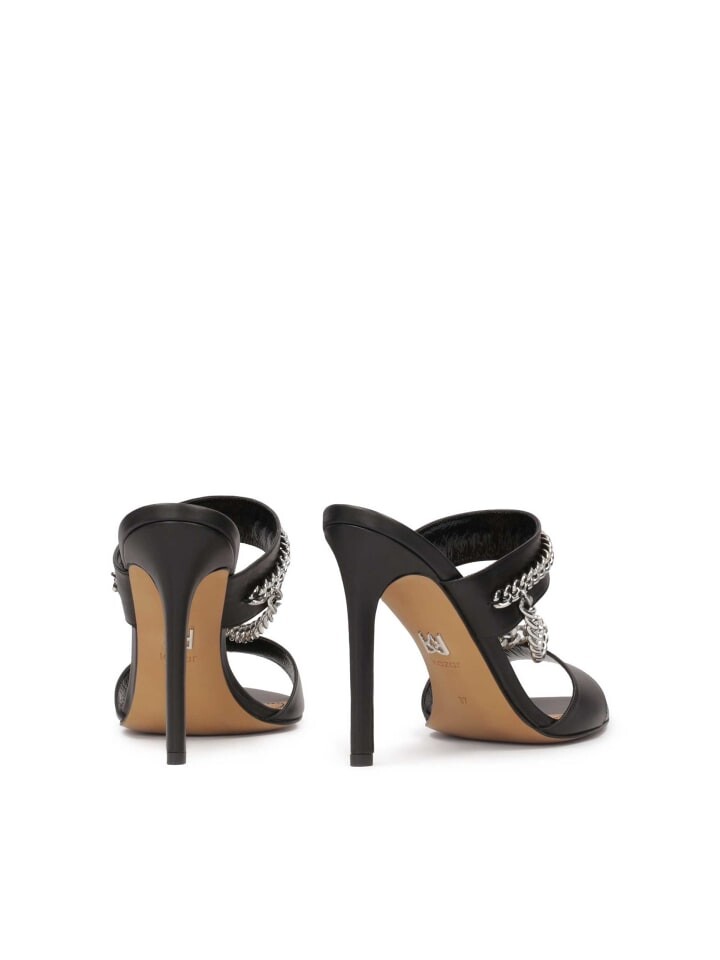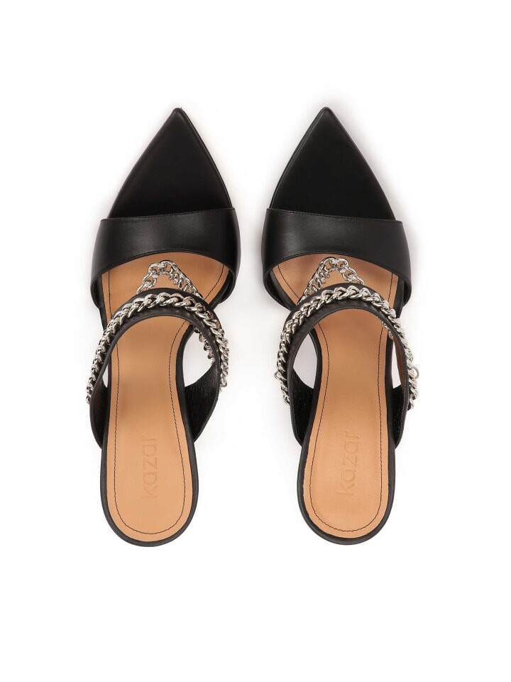 Черные мюли на высоком каблуке – символ элегантности и уверенности в себе, мимо которого невозможно пройти равнодушно. Изготовленные из зерненой кожи премиум-класса, они излучают роскошь и изысканность и идеально подчеркивают ваш личный стиль. Самым ярким элементом этой модели является двойная металлическая цепочка. Эта эффектная деталь придает мюлям неповторимый шарм и придает им нотку экстравагантности. Черные мюли с острым носком — идеальный выбор для женщин, которые ценят элегантность и хотят выделиться из толпы.