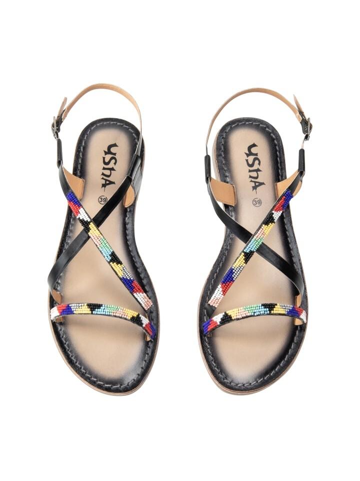 С этими сандалиями от Usha FESTIVAL вы сможете создать превосходный летний образ. Эта плоская пара выполнена в обычном стиле бохо с яркими изящными бусинами и ремешком на щиколотке с золотой пряжкой. Мягкая стелька и минимальный каблук завершают модель.