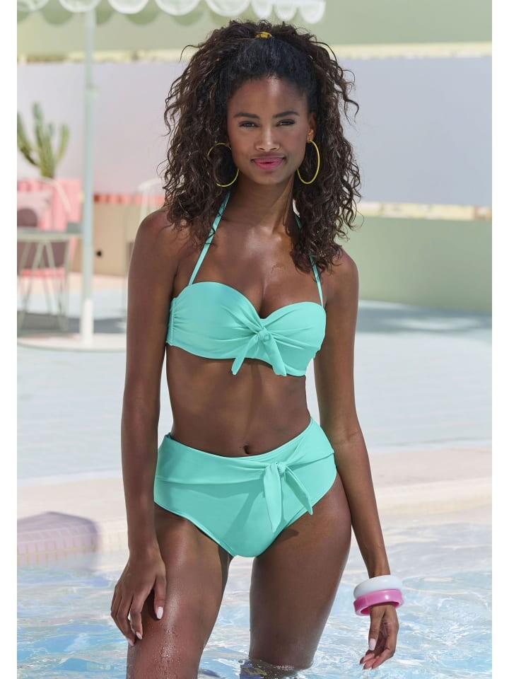 Бикини-бандо Buffalo на косточках. Топ со съемным воротником-хомутом, который можно завязать, с боковыми вырезами, мягкими чашечками и съемными подушками. Привлекательные трусики бикини с широкими бретелями по бокам. Центральный декоративный бант сверху и на трусах. Эластичный материал из переработанного полиамида.