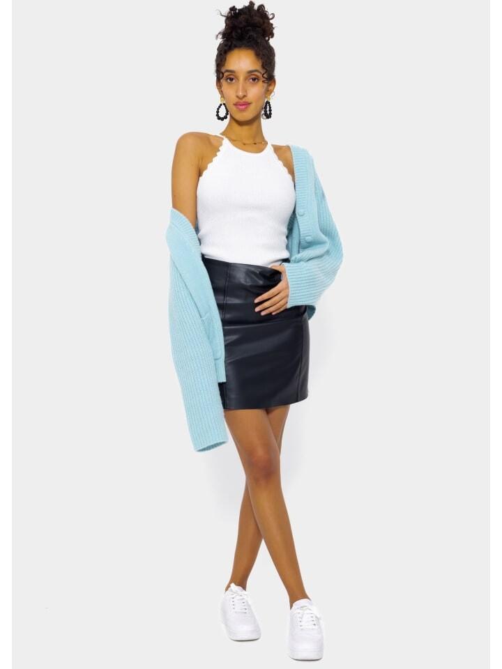 - Дизайн: современная юбка из искусственной кожи А-силуэта с гладкой поверхностью и бесшовные стороны. Идеально подходит для модного и элегантного образа.