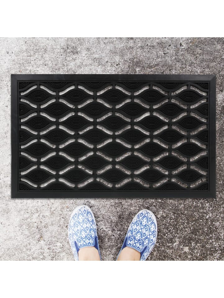 Коврик из прочной резины — практичный помощник, который защитит ваш дом от надоедливой уличной грязи. Благодаря черному цвету и современному дизайну с декоративными волнами коврик визуально выделяется и украсит как вашу террасу и сад, так и интерьер вашего дома. Придверный коврик выдерживает любую погоду и прочно прилипает к полу даже в снег и дождь. Вы можете очистить коврик водой всего за несколько шагов.