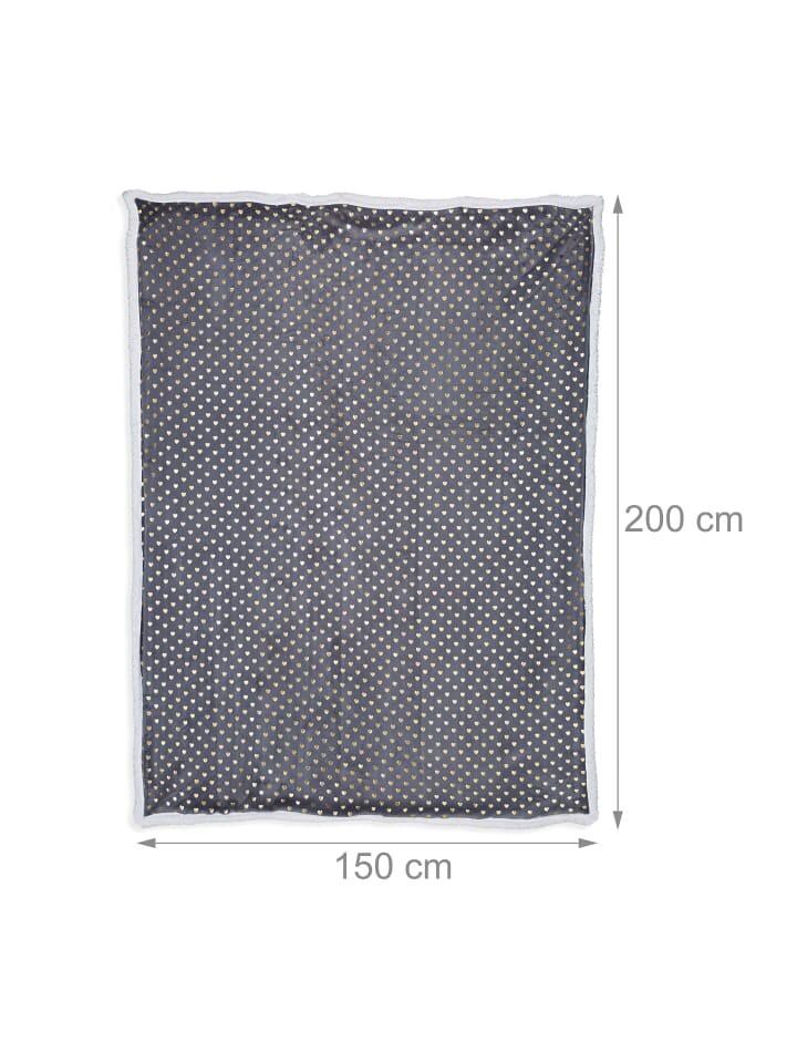 Что может быть лучше в холодное время года, чем после долгого рабочего дня свернуться калачиком на диване с чашкой чая или горячего шоколада? Пушистый плед серого цвета с декоративными золотистыми принтами – именно то, что вам нужно. Нижняя часть выполнена из белой овчины, обеспечивает приятное тепло и уют. Флисовое одеяло также идеально подходит для теплых летних вечеров на террасе или совместных вечеров под звездами.