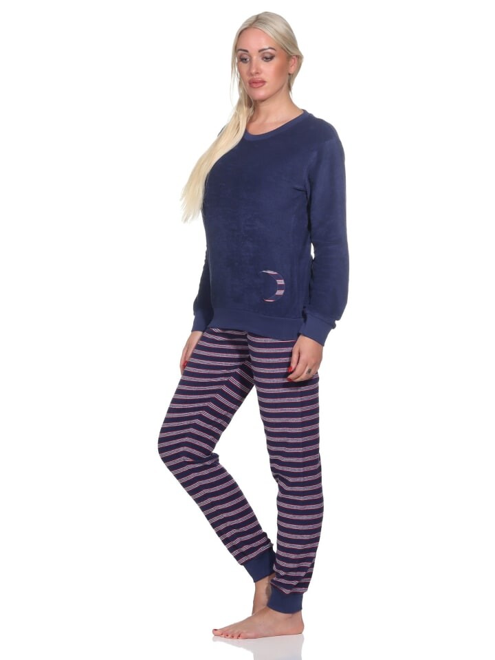 Луна взошла! Эта женская пижама с длинными рукавами из уютной махровой ткани имеет особенный вид. Верх пижамы украшен великолепной аппликацией в виде луны и/или звезды в качестве мотива, а штаны пижамы полосатые.