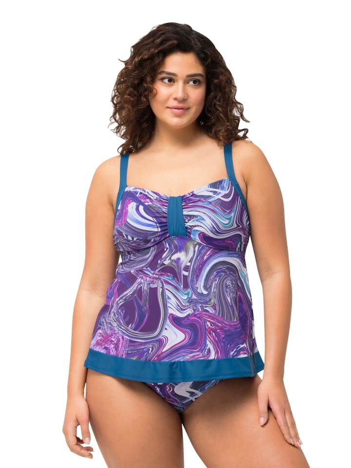 Танкини, двойка, с мраморным принтом. Удлиненный топ с мягкими чашками. Вставка с рюшами на груди, бретелях и подоле цвета драгоценного камня. Поддерживающая лента под грудью, подкладка спереди. Трусы в тон.