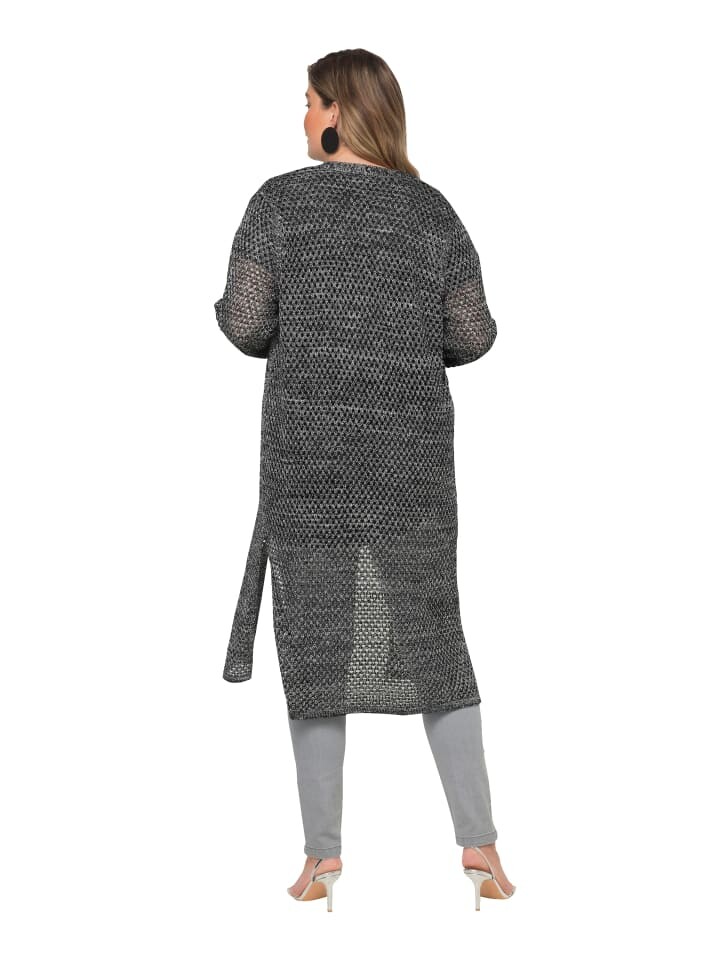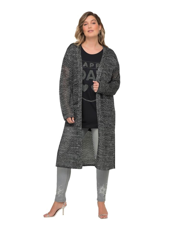 Длинный кардиган из слегка прозрачного трикотажа ажур с элегантным металлизированным эффектом. Длинная открытая форма с длинными рукавами.