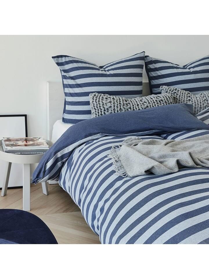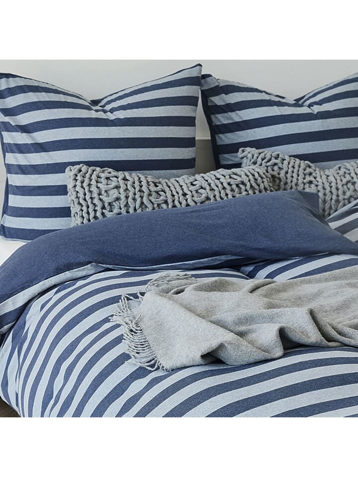 Естественная эластичность и легкая ткань. Чистый хлопок – вот что делает постельное белье в поперечную полоску от нашей собственной марки Traum Schlaf с безрисунковой спинкой синего цвета таким популярным.