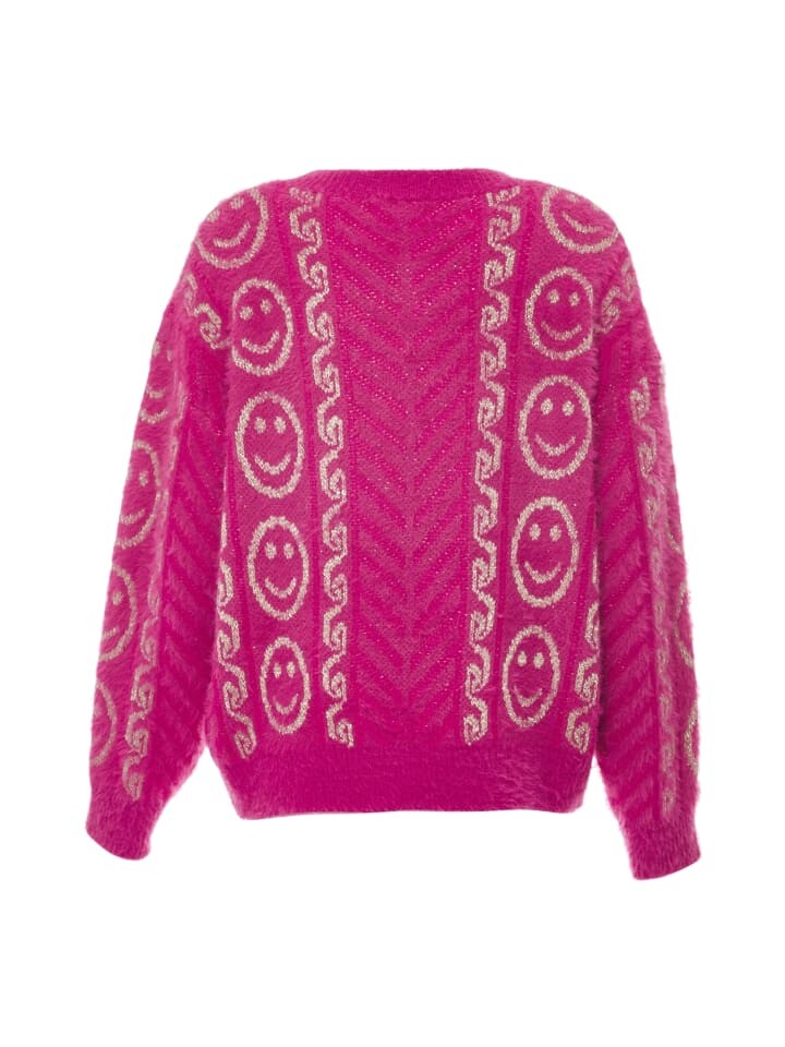 Этот вязаный свитер от ebeeza из смеси ворсованной пряжи имеет слегка ворсистый вид и интересный узор вязания со счастливыми смайликами. В дополнение к классической форме он отличается обрезанными плечами и завершающими ребристыми манжетами.