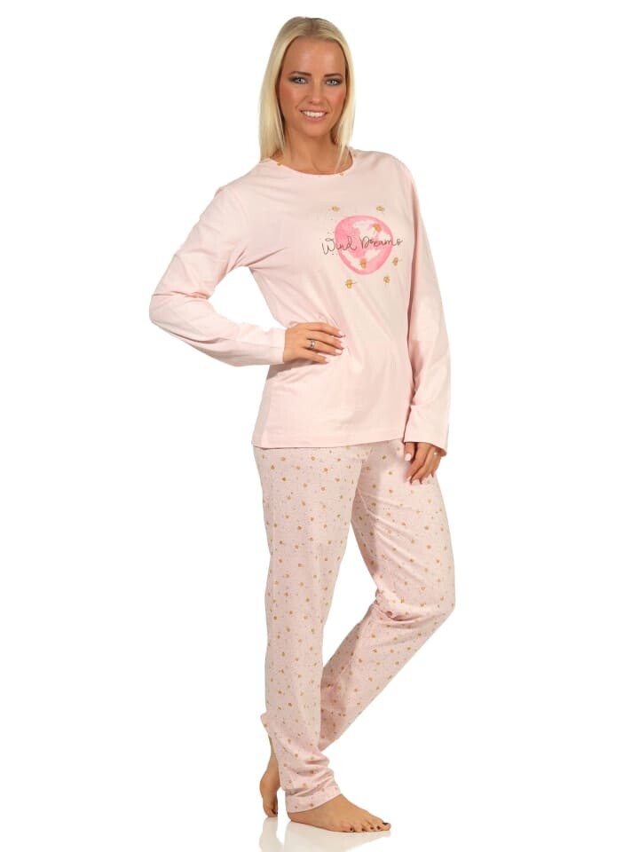 Эта красивая женская пижама с длинными рукавами подойдет всем, кто любит удобную одежду для сна! Верх пижамы украшен принтом в виде мотива, пижамные штаны из эластичного трикотажа украшены цветочным узором по всей поверхности, а цвет идеально сочетается с верхом.