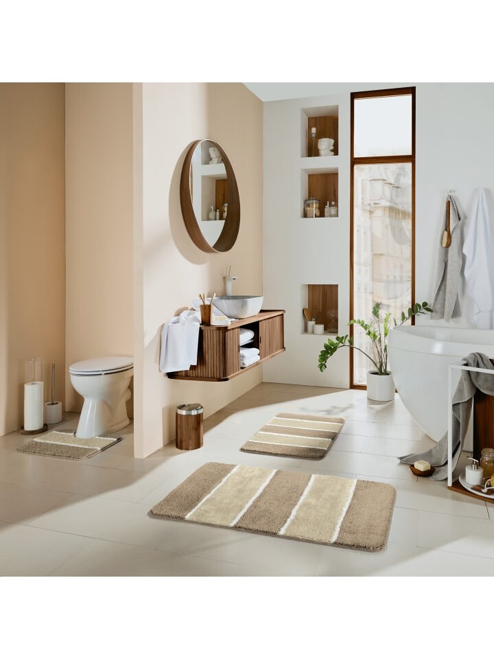 Коврик для ванной REDBEST. Блочные полосы в гармоничном цветовом сочетании создают современную атмосферу. Привлекательный аксессуар для ванной комнаты создает ощущение уюта босиком благодаря приятному мягкому ворсу на удобной высоте. Материал одновременно очень прочный и долговечный. Противоскользящее покрытие на спине. За ним легко ухаживать, он быстро сохнет и долговечен.