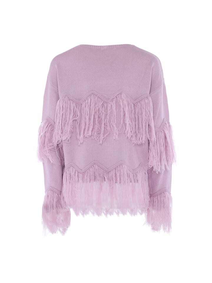 Откройте для себя стильный свитер с длинными рукавами, шикарным V-образным вырезом и сложной текстурой вязки. Благодаря игривой бахроме, расположенной в несколько горизонтальных рядов, это изделие придает динамичность и декоративность. Ребристые манжеты и подол создают изящный контраст с мягкой бахромой, создавая непринужденную посадку, которая идеально подходит для повседневной или модной одежды. Завершена тонкой фирменной этикеткой на вырезе, которая поможет легко обновить ваш гардероб.