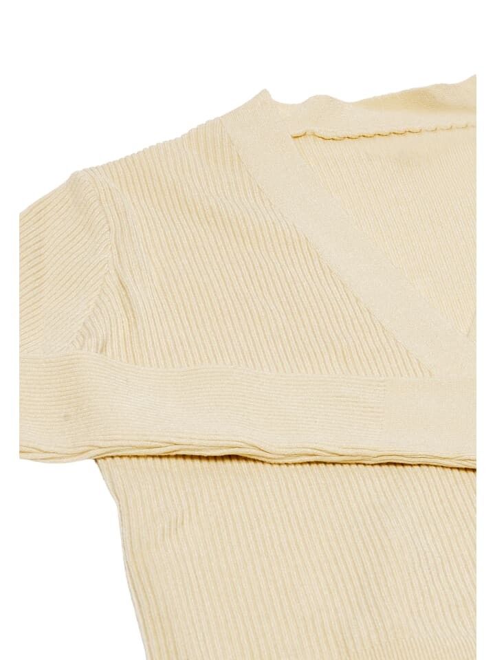 Обновите свой гардероб этой шикарной вязаной одеждой. Ребристая текстура и глубокий V-образный вырез с завязкой спереди подчеркивают повседневную элегантность. Длинные рукава с приталенными манжетами придают нотку элегантности, а укороченная длина обеспечивает универсальность для многослойной одежды или в качестве стильного варианта многослойной одежды.