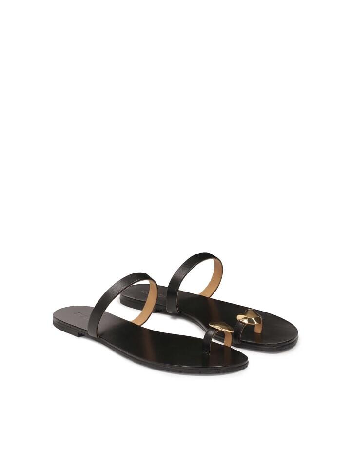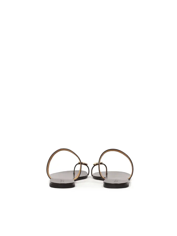 Элегантные сабо на плоской подошве из зерненой кожи черного цвета – отличный выбор для женщин, ценящих минимализм и комфорт. Два тонких ремешка из высококачественной лицевой кожи сдержанно смотрятся на ноге, а металлические вензеля с кристаллами, которыми они украшены, привлекают внимание и придают туфлям роскошный вид. Эти тонкие детали делают мюли идеальным выбором как для повседневных прогулок, так и для более официальных мероприятий.