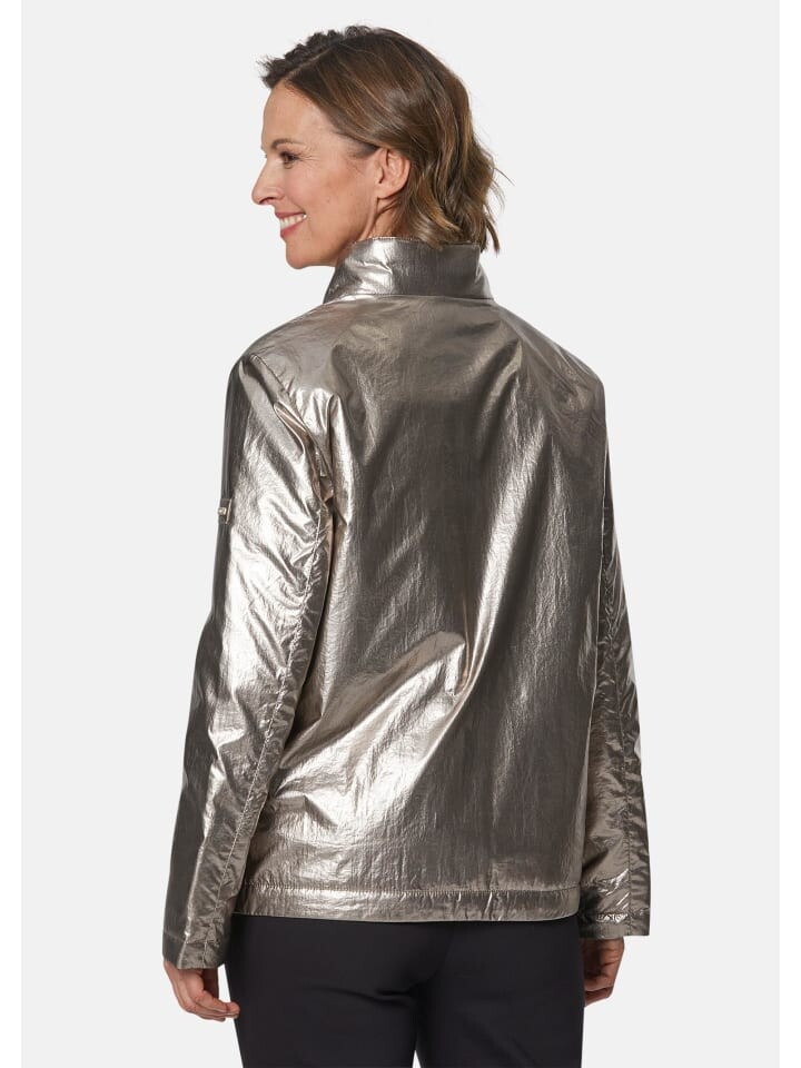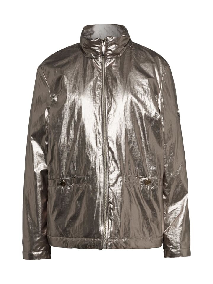 Жакет модной блузонной формы. Эффектный внешний вид и необыкновенный металлический эффект придают модели особый характер. Оснащен воротником стойкой, застежкой-молнией и карманами на кнопках. Симпатичный компаньон имеет легкую подкладку и идеально подходит для переходного периода. Длина около 67 см по размеру. 46, размер около 63 см. 23.