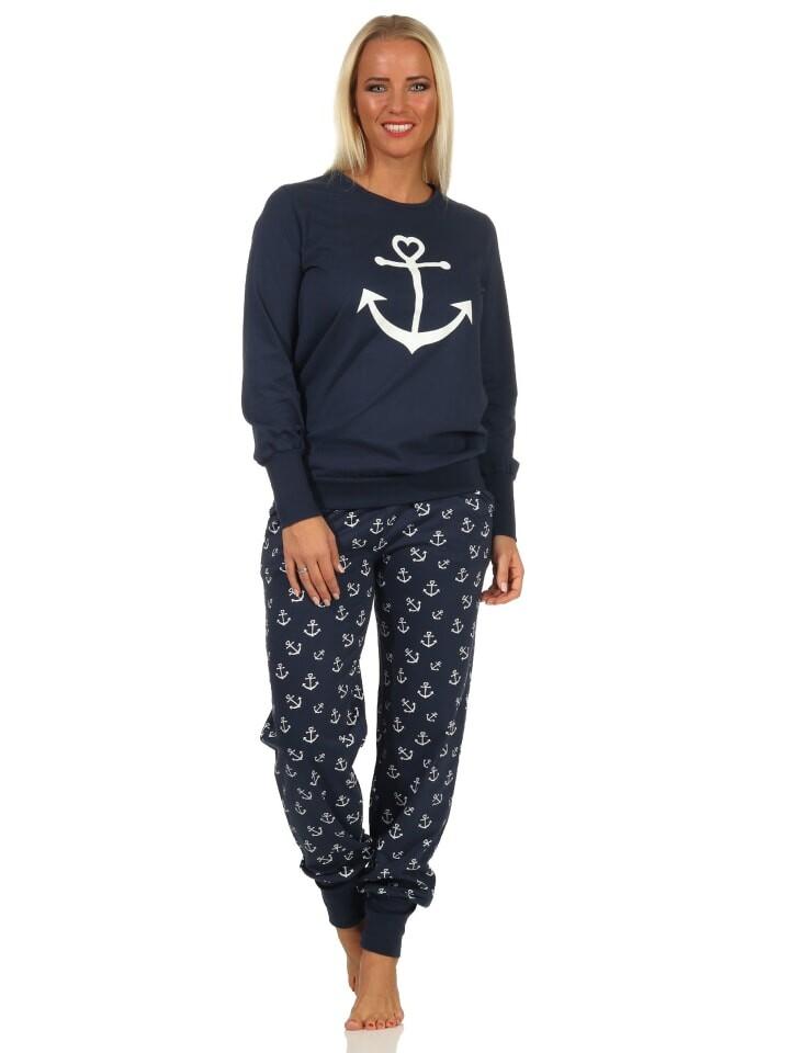 Хотите море? Тогда эта красивая женская пижама морского цвета с длинными рукавами и манжетами — идеальный выбор для вас! Низ пижамы имеет великолепный морской вид и украшен мотивом в виде якоря. Верх пижамы однотонный, с мотивом в виде якоря.