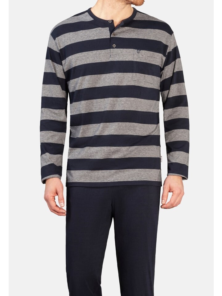 Негладкая пижама из мерсеризованного хлопка из серии Klima Light. Удобный костюм-двойка состоит из длинных брюк с двумя боковыми карманами и рубашки с длинными рукавами и короткой планкой на пуговицах.