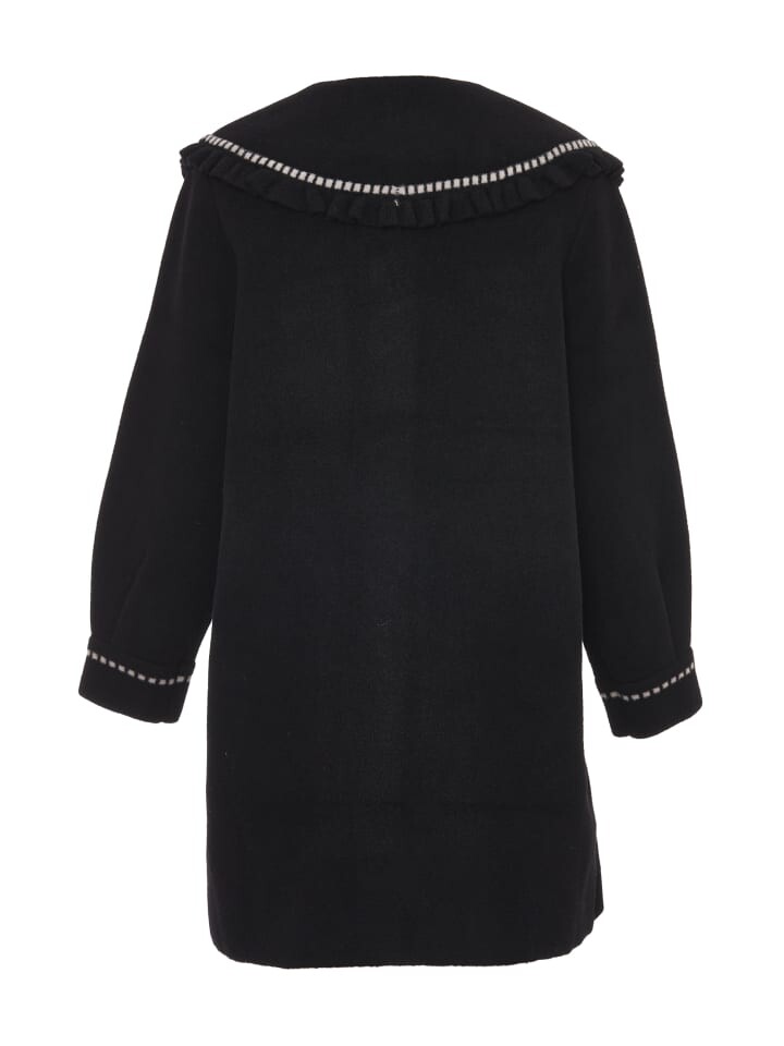 Идеально скроенное пальто имеет классический прямой силуэт. Воротник «Питер Пэн» благодаря зубчатому краю и контрастной отделке добавляет игривости. Передняя застежка, украшенная уникальными треугольными пуговицами с логотипом, излучает изысканность. Длинные рукава с соответствующими манжетами и бесшовно интегрированными боковыми карманами завершают образ.