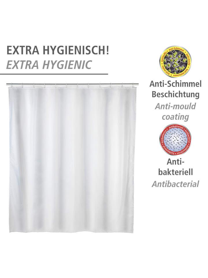 Особенностью занавески для душа Uni White является сенсационный эффект защиты от плесени! Времена заплесневелых занавесок для душа прошли. Кроме того, красивый и эффективный помощник имеет еще и антибактериальное покрытие. С этой новинкой WENKO привносит в ванную комнату гигиену и дизайн. Конечно, эта занавеска для душа запатентована ЕС.
