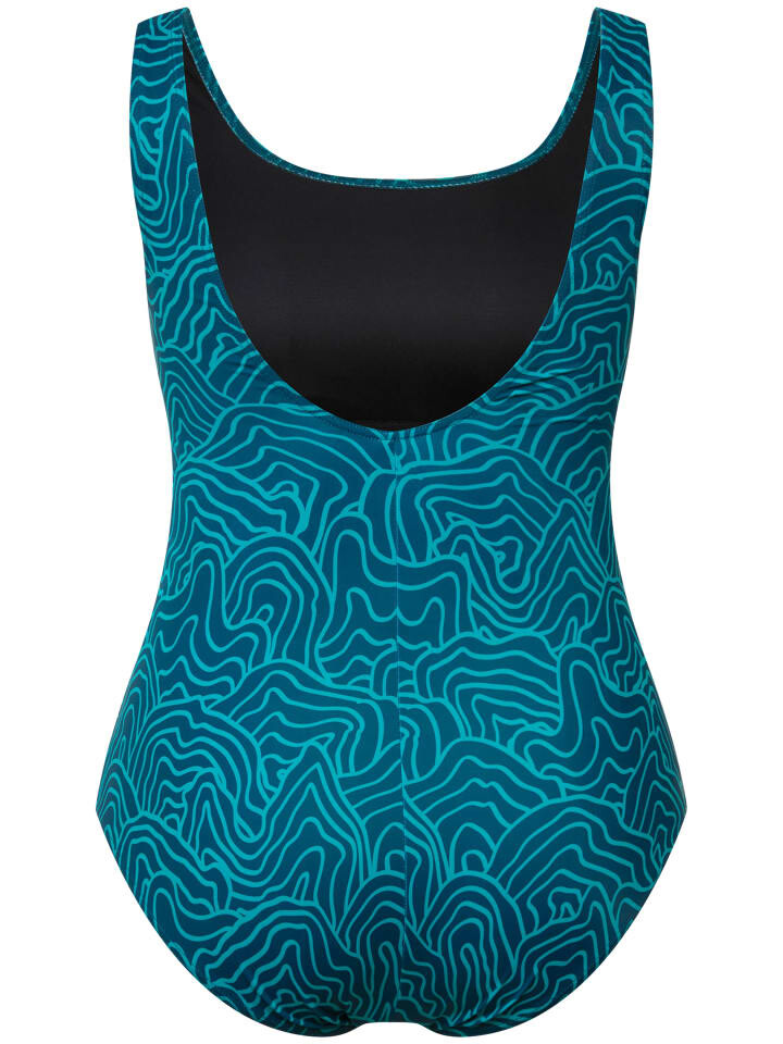 Купальник без мягких чашек с современным принтом. Мягкая передняя подкладка, пояс под грудью. Глубокий вырез сзади.