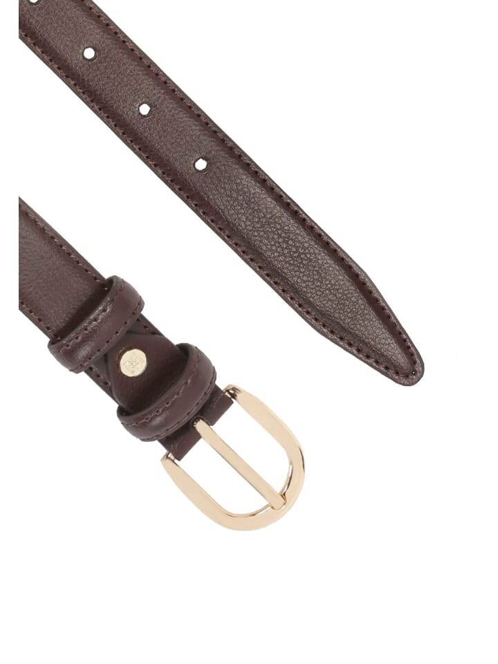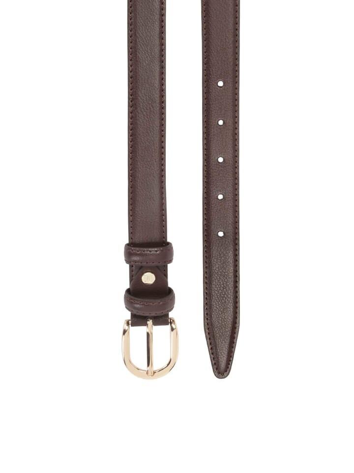 Женский ремень из высококачественной лицевой кожи впечатляет ярким темно-коричневым цветом. Сочетание этого цвета с золотой пряжкой делает эту модель вневременным и универсальным дополнением. Узкий ремень - прекрасное дополнение к модным нарядам, он придает фигуре легкость даже при платье оверсайз.