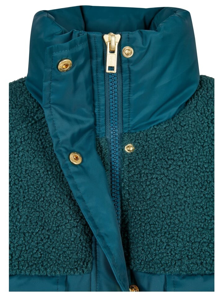Эта модная женская куртка-пуховик темного цвета с контрастными плечами станет популярным спутником в холодные дни. Тепло и комфорт обеспечивают продуманное сочетание материалов с набивкой и подкладкой, а также удачный крой. Теплый воротник-стойка и молния, спрятанная под планкой на пуговицах, обещают практичную функциональность. Женская куртка также заслуживает внимания благодаря большим нагрудным карманам и двум боковым карманам. Стиль этой привлекательной женской куртки-пуховика удачно завершается туннелем на талии, который придает ей форму.