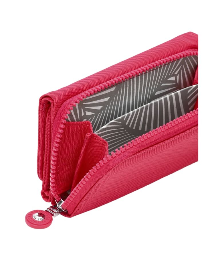 - Тисненая эмблема на клапане придает нотку стиля, а тонкий профиль указывает на внутренние отделения для карт, денег и монет.