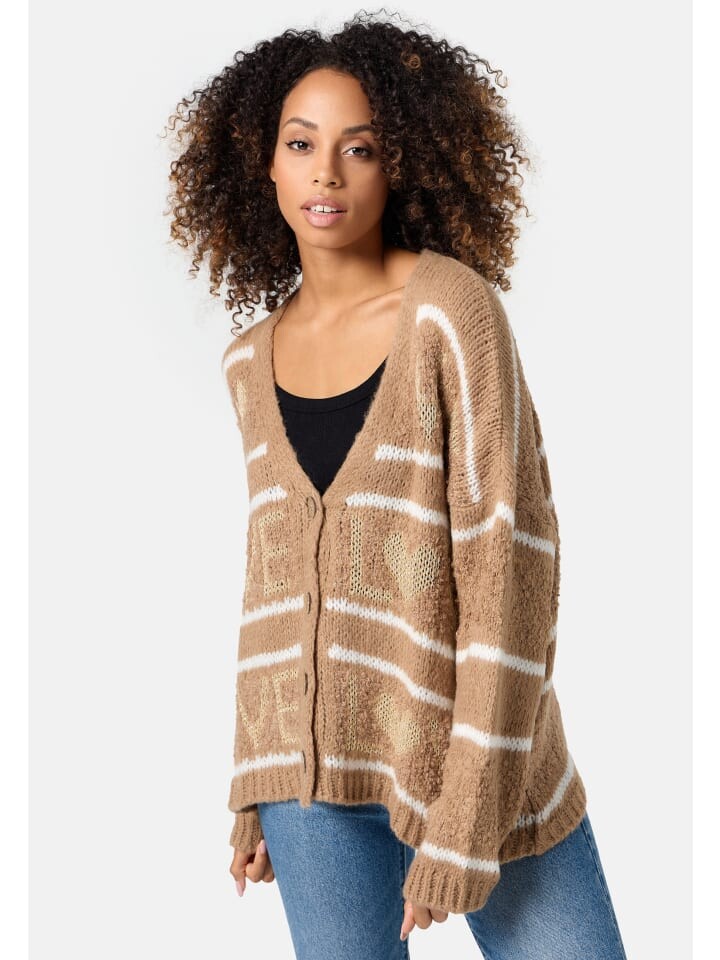 Уютный женский кардиган на пуговицах в праздничном стиле. Элегантный кардиган очаровывает вязаным металлизированным узором Love из золота и очаровательно игривым сочетанием материалов. Нежный полосатый узор женского кардигана дополнен золотыми нитями и букле. Красивое сочетание узоров и материалов несколько раз проходит по куртке и создает гармоничный образ. Большие деревянные пуговицы привлекают внимание. Рукава свободного покроя заканчиваются широкой манжетой. Подол также заканчивается трикотажным поясом. Трикотажная куртка без воротника имеет глубокий V-образный вырез и застегивается на 4 пуговицы. Приятный, не царапающий материал комфортен для кожи и благодаря содержанию шерсти сохраняет тепло даже в холодные дни.