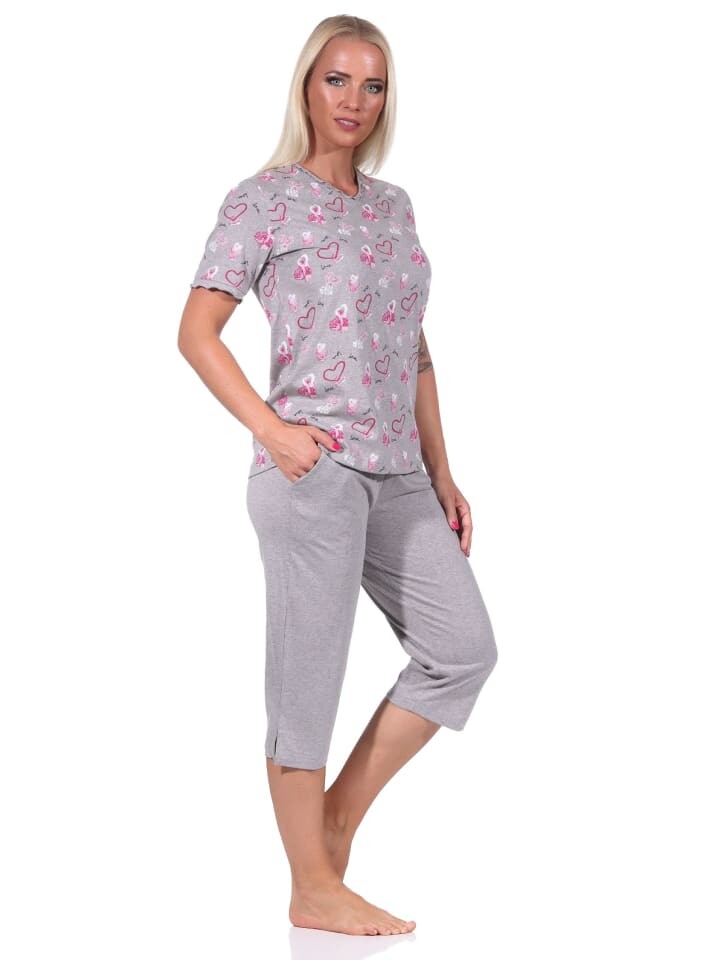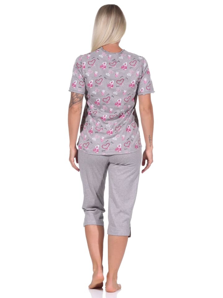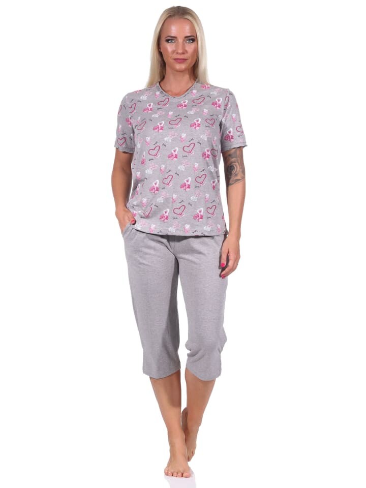 Красивые женские пижамы-капри с короткими рукавами от Normann в меланжевом исполнении, мотивом которых является сердечко. Капри длиной 3/4 пижамы украшены сердечками по всей поверхности, верхняя часть этой пижамы с короткими рукавами также украшена сердечками в виде размещенного принта.