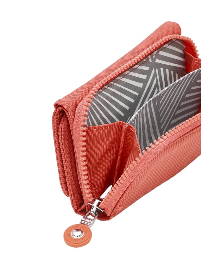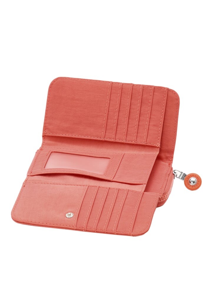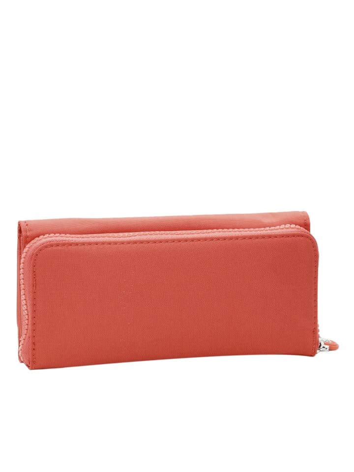 - Тисненая эмблема на клапане придает нотку стиля, а тонкий профиль указывает на внутренние отделения для карт, денег и монет.