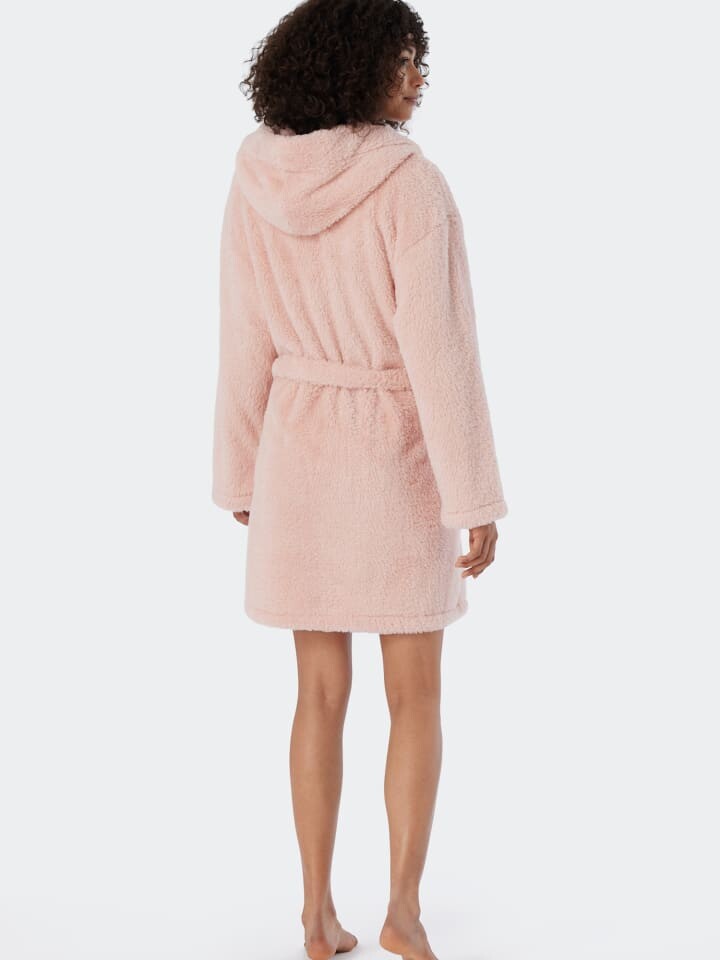 Представляем: Наш милый любимец в модной короткой форме! Этот халат просто идеален для женщин, которые любят тепло и уют. Потому что короткое пальто из-за очень пушистого и легкого плюшевого флиса создает ощущение нежного объятия. Большой капюшон, регулируемый ремень и накладные карманы добавляют очаровательных деталей. Все, чего не хватает, - это лучшее, устойчивое качество SCHIESSER, и ничто не помешает чистому хорошему самочувствию дома!