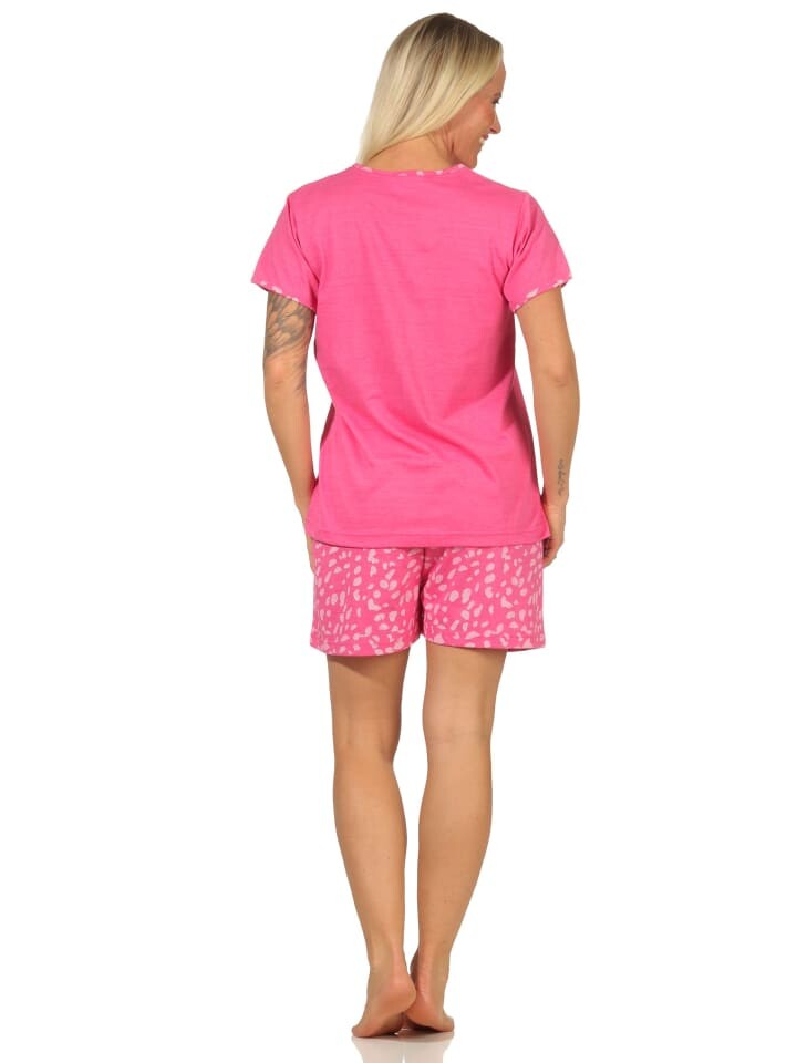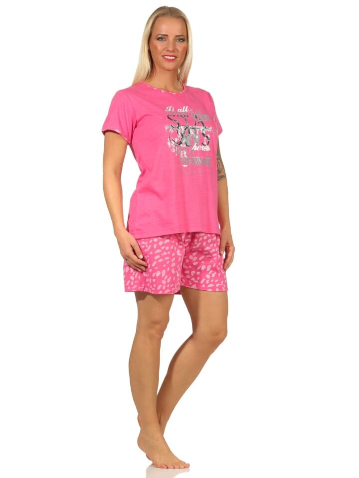 Всегда в хорошем настроении! Эта красивая женская короткая пижама с короткими рукавами подойдет всем, кто любит удобную одежду для сна! Верхняя часть короткой пижамы украшена декоративным мотивом, короткие пижамные штаны из эластичного трикотажа украшены принтами по всей поверхности, а цвет идеально сочетается с верхом.
